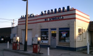 What struck me most as we drove east from Grinnell along Highway six through several small Iowa towns in central Iowa last Saturday was the remarkable collection of well-preserved old business signs, several neon, adorning store fronts. It felt like we were on the set of “Back to the Future.” Below is one of my favorites in Brooklyn, Iowa. (You have to drive off the highway and go into town to see it.) It’s a wonderful old creme-colored tile building decorated with vintage letters that spell out: Service Standard Oil Products.