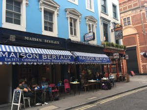 I met Francine at her office near Victoria station (which is a chaotic area now due to construction) and we went nearby to a little (DDK Kitchen) cafe for a sandwich. Then I went to my old stomping ground, Covent Garden, which sadly I didn’t find particularly interesting. Lots of tourists and the shops are now mostly chains or fancy boutiques. The small little independent places I used to love are gone with the rare exception including the Neal’s Yard Dairy, which imports its Stilton to far flung places like Des Moines, and Maison Bertaux a French patisserie/cafe on Dean Street (not Frith as I originally thought.)