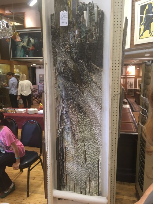 We also wandered into Moosejaws, a Detroit outdoors store, among several inviting cafes and shops nearby and more to come — a big Shopping Center is rising soon on the site of the famous old Hudson’s Department Store that I used to go to with my mom in the 1960s and 70s. We also dropped in at a famous old auction house across from RenCen and by far the best piece for sale was a piece by Glen Michaels, father of a high school friend.