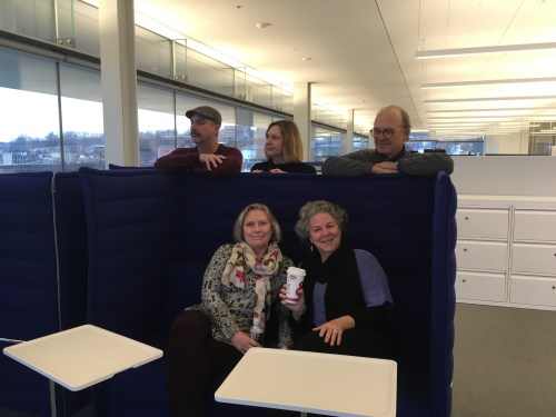 The interior design is sparse and clean with immaculate desks – in various configurations and groupings. There are high top tables, lower top desks, sitting spaces in an upholstered nook that felt a bit like a padded cell (except one side is open.) Most people don’t have assigned desks. Employees do get their own locker, to store their stuff, which they remove and place wherever they plant themselves during a given day. I gather this is au currant office design (and supposedly spurs more collaboration) but also takes some getting used to for employees accustomed to the creature comforts of their very own cubicle, slathered with family photos, gag bobble-heads and stacks of yellowing paper, yes, paper.
