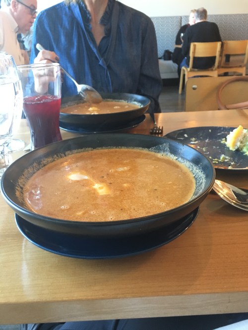 Shrimp Chowder at Panka (and almost-devoured Causa to the right). The purple drink is a Peruvian classic — Chicha Morada, made with purple corn, fruit and spices.