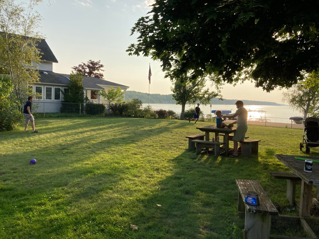 Nice evening settling into our funky old cottage in Beulah with an enormous screened-in wrap around porch, a huge yard for frisbee playing and picnic tables directly overlooking Crystal Lake. We sat outside in plastic Adirondack chairs and watched a spectacular sunset at 9 pm, the sky bright red and orange sinking into the water on the horizon.