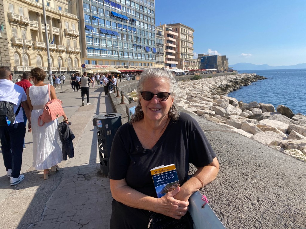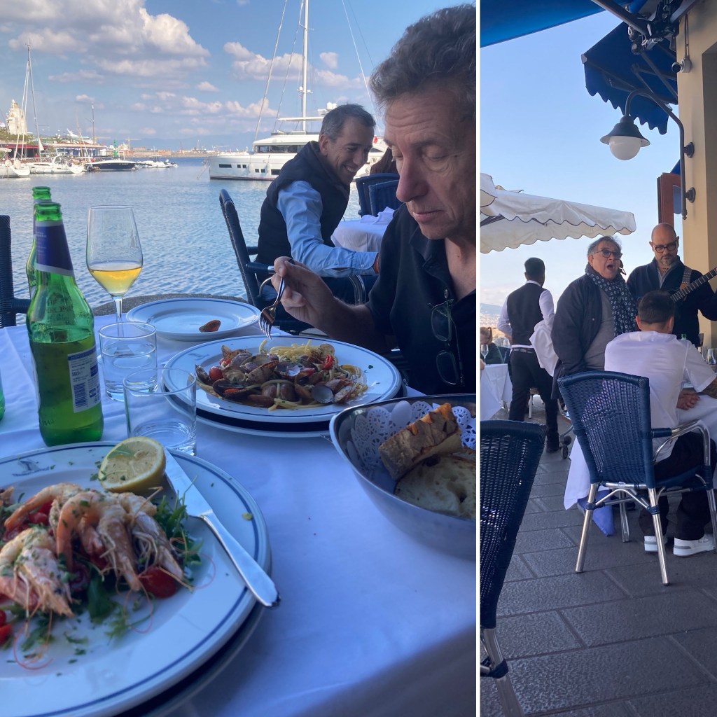 Onto the gorgeous waterfront promenade (lungomare) where much of Naples seemed to be strolling on a perfect Sunday afternoon. We ended up on a little fisherman’s wharf, Borgo marinero, at a pricey but lovely seafood restaurant transatlantico where we had outstanding spaghetti vongole (clams, white wine sauce), listened to a traveling singer-guitarist duo serenading tables (inspiring at least one couple to get up and dance), watching boys catch fish and boats drive in from the shimmering sea along a little channel lined with large fancy hotels and apartment buildings.