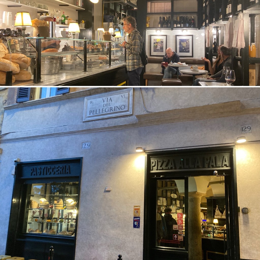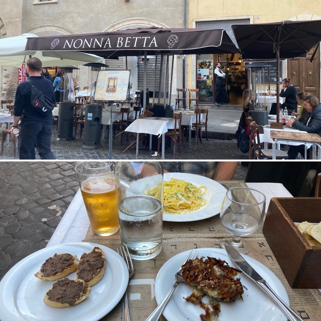The weather continues to be gorgeous- sunny, low 70s, so we did what we like to do most in Rome: walk, eat, windowshop. First stop the nearby former Jewish ghetto where we had excellent food at Nonna Bette, a kosher restaurant – fantastic grilled artichoke (carcofi), chopped liver/crostini, carbonara with zucchini, ricotta cheesecake. Then on to windowshop in center storico on a few streets (via del Pelegríno and di Monserrato) dotted with interesting boutiques, design shops, cafes and bakeries.