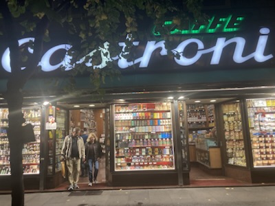 We stopped for an overpriced orange juice and espresso at a cafe overlooking the piazza de populi, which offered a welcome rest and good people watching. Then we meandered back to our hotel (about a half hour walk…we taxied to the gardens), stopping at a well-populated osteria on a small street (l’osteria di memmo Santori on via Dei Soldati,) for one last plate of pasta. We ended up briefly visiting a holocaust museum (free, but we made a donation) in the old Jewish ghetto which had wrenching stories from Italian concentration camp survivors. Dinner tonight was at garbarini, a deli by day that becomes a dinner spot by night, located in the Upscale Prati neighborhood. Fun to be the only non-Italians there.we found a huge speciality food store, Castroni, next door. Goodbye Rome. We’ll be back.