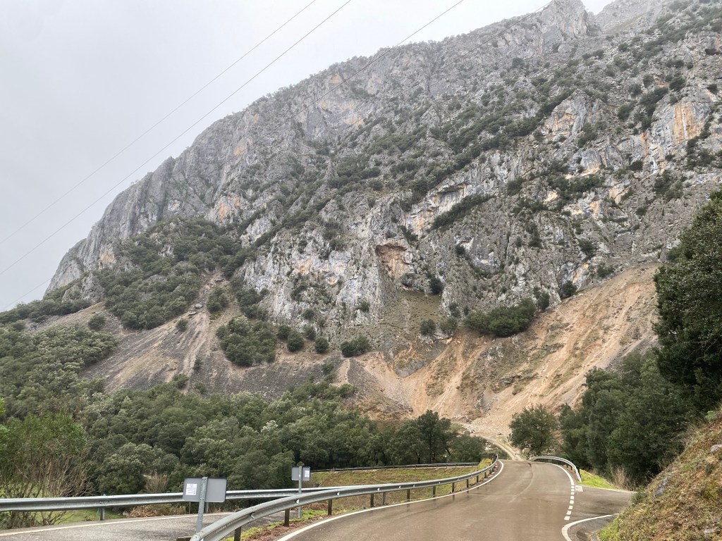 We drove from Panes south to Potes over the mountain. Same road over crest of mountains, passes, valleys meet there, river, towards the funicular. Also took a narrow winding road up a cliff near Puente de Hermida hot water spa, drove up a mountainous cliff.
