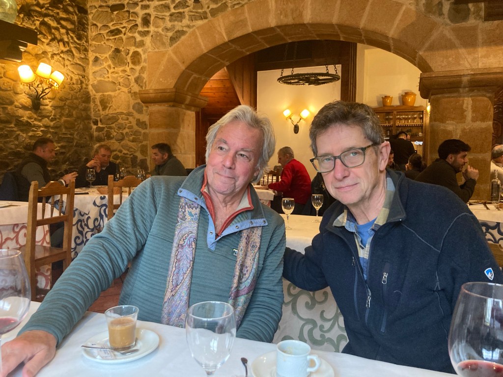 Lunch was at an old Spanish Restaurant el bodegon where no one balked at four yanks walking in with two large white dogs. Ollie and Leto camped out under our table, hidden by a tablecloth and never made a sound. We dined on roasted lamb, steak, sweetbreads, lamb chops and potatoes; bean soup, cold white asparagus with swirls of mayonnaise, cold marinated leeks.