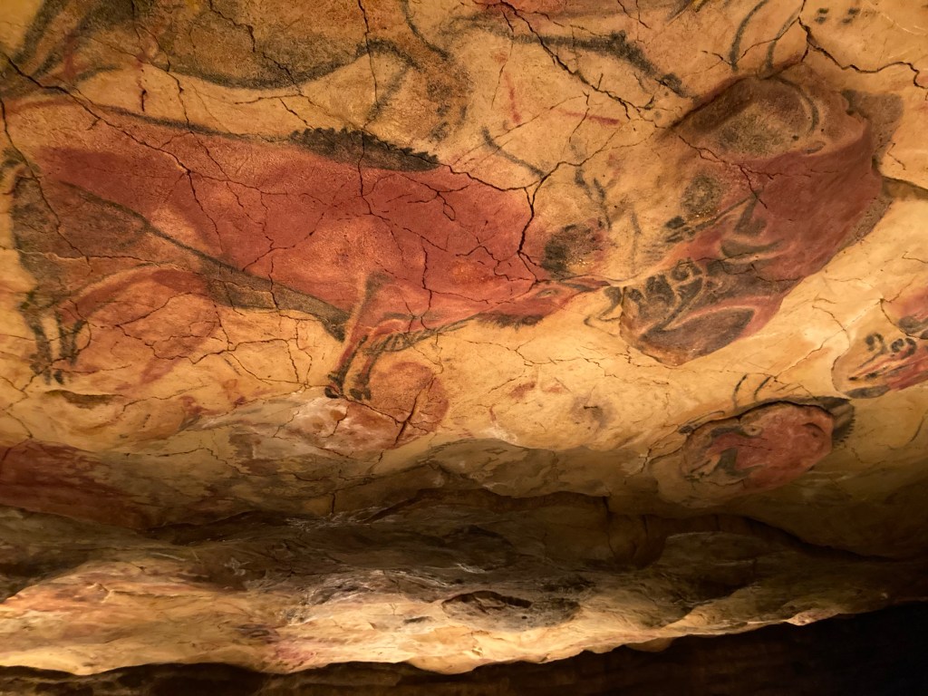 Our drive east was along a narrow curving road high above the water. We went to the Museo de Altamira, a “neocave” near the famous ancient city of Santillana Del Mar, which is a remarkable reproduction of the ancient cave and its red and black cave paintings of bison, horses and cows dating back 15,000+ years. Apparently the real cave nearby is too fragile for visitors so this reproduction was created. Not quite like the real caves we’ve visited but impressive in its own way, for its apparently faithful reproduction.