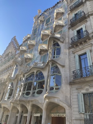 This morning we went on a 3 hour architecture tour with an architect/engineer professor that stretched into 3.5 hours. There was one other lovely couple from Tucson. The tour was good but a little too much time was spent on the engineering intricacies. I was more interested in Antonio Gaudi’s art, design and personal story rather than the construction details. But we did see three of his major buildings (outside only) and were told Casa Mila (aka La Pedrera) is the one to tour inside, beyond the church which we will visit tomorrow. It’s the city’s classic modernista building.