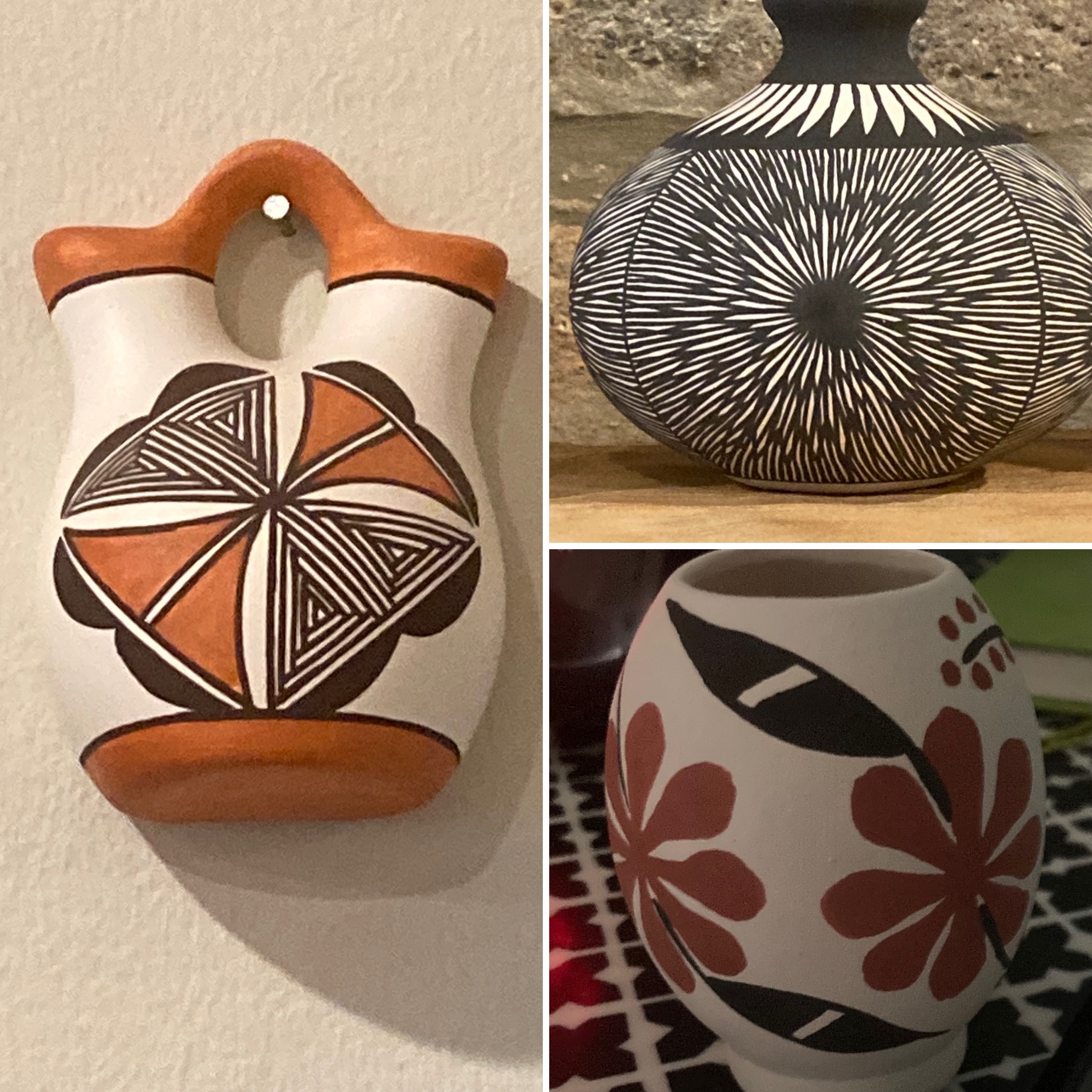 Acoma’s traditional wedding vase is thin-walled and hand-painted with natural pigments made with plants and minerals by artisans using slender brushes made from yucca fibers. The clay is sometimes strengthened by adding shards of older pottery. Instead of using a wheel, artists use a “hand-coil” method that starts with a method I remember as a kid: rolling long “snakes” of clay. These are stacked to form the vessel. Then comes the non-kid part: gourd scrapers and river stones are used to scrape and polish the surface until smooth. But today, some are made in a more pre-fab way, using pre-cast or molded (clay poured into a mold) pottery (maybe like the kind found in paint-your-own-pottery places?) The molded pottery is heavier, more uniform looking; the hand-made coiled pottery has tell-tale signs inside (coarser, uneven, some tooling marks).I couldn’t tell with the two pieces I bought – they’re lighter than a tiny wedding vase I bought years ago near Acoma and also signed on the bottom with someone’s name.