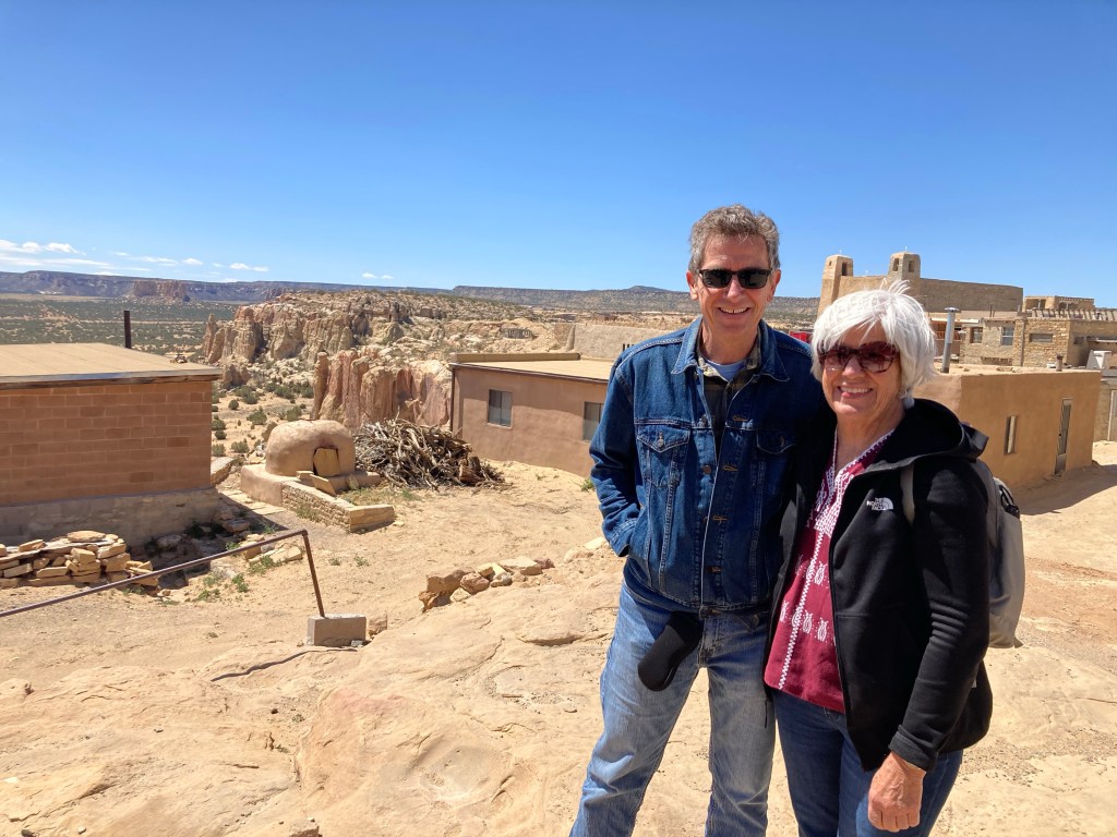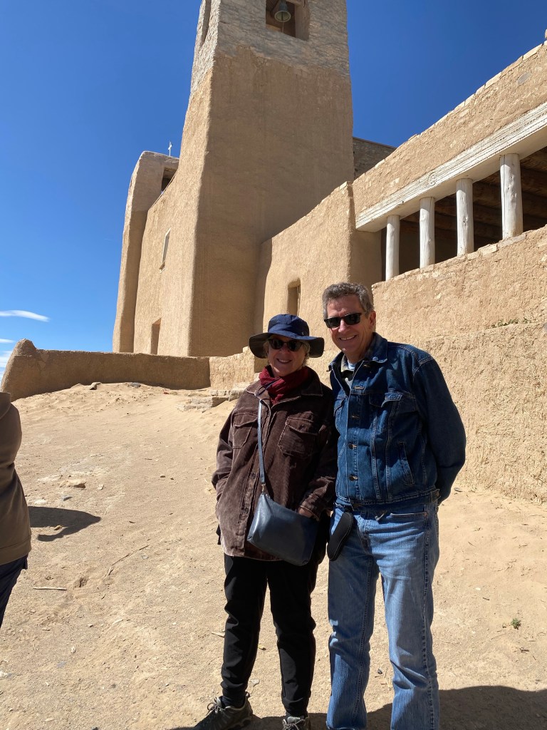 We were among about 20 tourists who piled into a shuttle bus on a crisp spring day at the attractive contemporary Sky City Cultural Center (which has a museum and cafe) to drive up the one road winding to the mesa. Then a guide showed us around the small village of simple rough-hewn adobe house. A smattering of people live part-time so it has an eerie, abandoned, ghost town feel. (There’s no water or electricity). Otherwise they live primarily in three small towns nearby. The most impressive building is a massive adobe church with high ceilings, colorful painted designs of white walls. (Photos not allowed pf the church or cemetery, where we spotted the grave marker of someone named Betsy.)