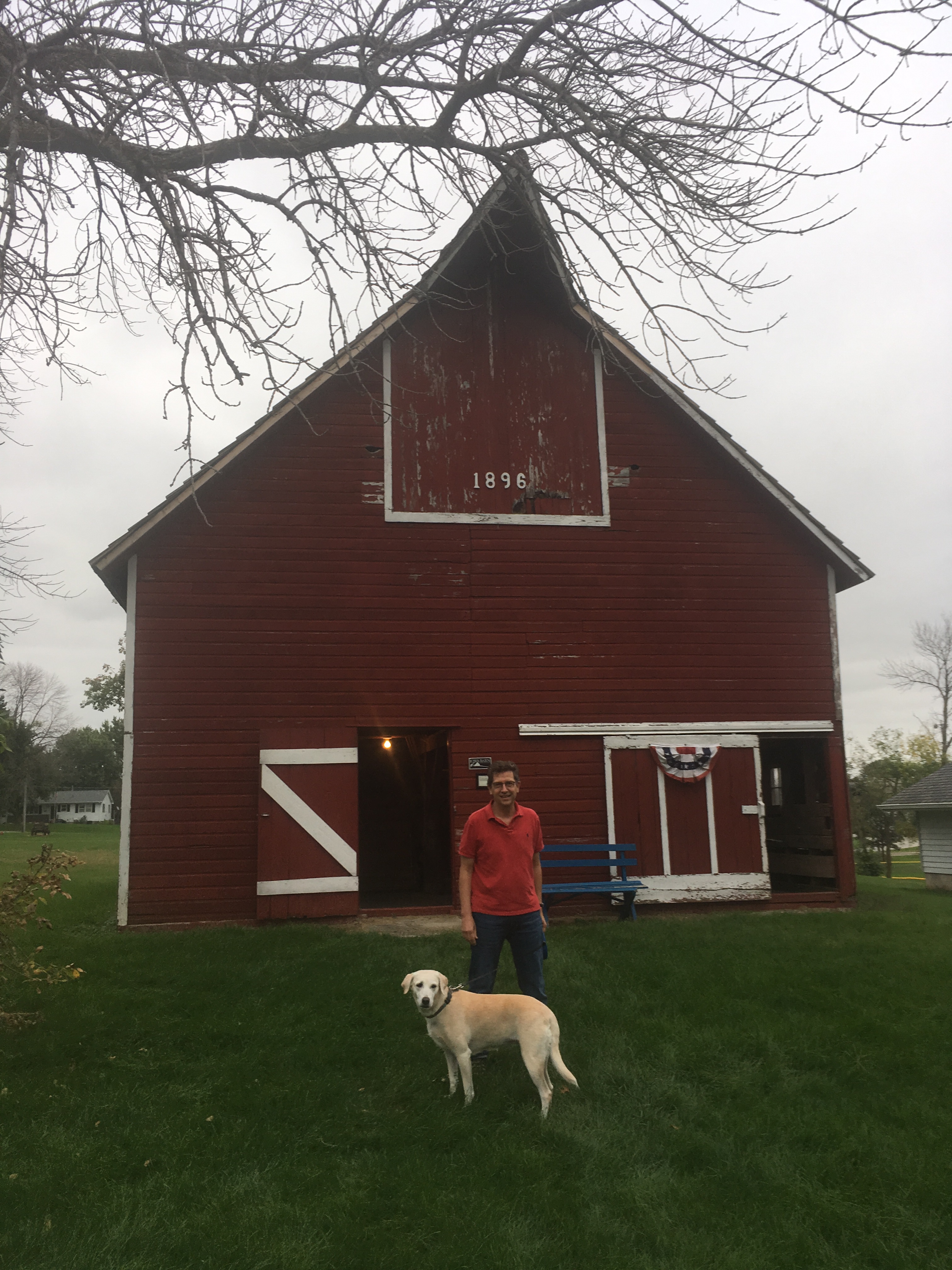 Millie, our lab, came with us again and enjoyed sniffing around the old barns. The first we visited was a 19th century red wood beauty we finally found (GPS kept sending us to dead ends) in a little c county historical village in the small city of Creston. The “(New) Union County Barn” aka “Harris Barn” built in 1896 had been relocated from the countryside so it felt a little less authentic but inside, it was the real deal, with old dairy equipment, wood stalls for animals, a high hayloft and a rope, presumably to swing in the hayloft. (Or hoist hay bales into the loft.) (We’re told it’s: a perfect example of post and beam construction with diagonal braces. Horizontal cladding is rare and is associated with Civil War veterans.