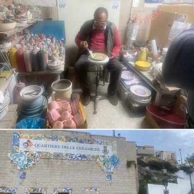 In the late afternoon we drove about 35 minutes south to a grittier town famous for ceramics called Grottaglie, near the Ioanian sea side of Puglia. We finally found a parking spot right in front of the best known ceramics shop (on a street lined with shops) Nicola Fasano, where we bought two contemporary pieces (not the traditional Italian ceramics.) Even bettter, the owner, who comes from a long line of ceramicist owners took us and a few others on a tour of the manufacturing shop in nearby caves. He told us he’s been hard hit by Chinese copycats, and now works particularly hard to produce original pieces not easy copied. At one point he sat at a spinning wheel that he used to decorate several plates, sort of like an old fashioned Spirograph or spatter art. It was mesmerizing. I later learned from a Vogue Australia article that the shop’s customers have included Francis Ford Coppola and Armani.