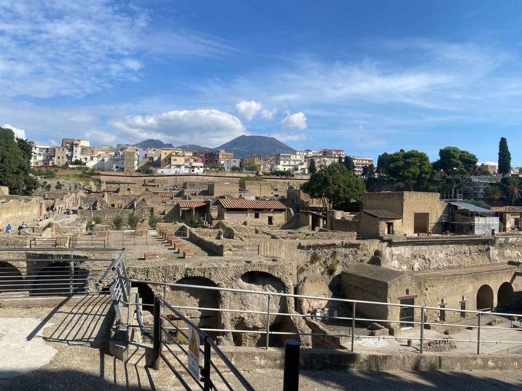 The ruin is well-designed, with a cool little museum to start, showing the ancient artifacts found on the site that resemble modern-day utensils (tweezers, jewelry, colanders, pans): ancient Italians R Us! It also juxtaposed the items with artistic renderings found in frescos or other artwork. Then on to the site itself, compact and easy to visit, unlike the massive and more famous Pompeii nearby (which I visited in 1982). You can really get a feel for the place, with its remnants of houses along one street and shops on another, including a wine shop with a fresco of the wine prices! A few buildings retain patches of their original frescos in bright umber and orange and red. What a sight this place must have been in its prime.