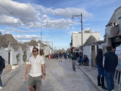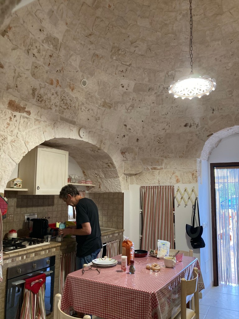 Next: a rather stressful drive southwest of Bari in the drizzle to a small village Borgo Lamie di Olimpia about Five km north of Locorotondo where we finally found the trulli (a traditional conical-shaped building) Airbnb that we are staying in for a few days. thank god for a rare business and landmark, Bar Lamie, where we met our Airbnb proprietor, who walked us about a block to our trulli. Later, D and I walked in the drizzle back to the bar where we were greeted by some gregarious locals and had a well-deserved Peroni.