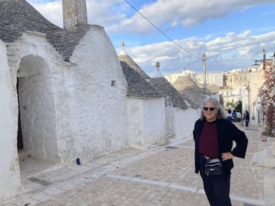 There are also several overlooks with spectacular views of the valle d’Itria , dotted with trulli complexes, some dripping with purple or red borgenvia. Dirck navigated some crazy scenic narrow lanes today, lined with high dry stone walls, in front of vineyard and olive trees. And he drove on the unscenic autostrada along the sea, which was a bit hairy at times, with cars entering from the right on lanes that soon ended so they had to merge, leaving us unclear how to get out of their way. We later noted they seem to stop before merging.
