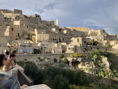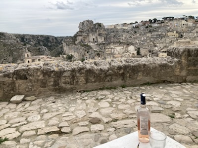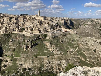 Matera is otherworldly, especially at night when the caves and stone buildings built above the caves are lit up. Our Airbnb has an astonishing view from on high, looking out at a hillside above a canyon the lit-up sassi (stone caves and buildings built into and on top of the caves) and the dramatic church Santa Maria de idris (circa the 14th century) built into an enormous towering rock. The place is a self-contained canyon, hidden from the world beyond. Matera’s history goes back to the Stone Age. Today it has two historic “sasso districts.” (Our Airbnb is in Sasso Caveoso.)