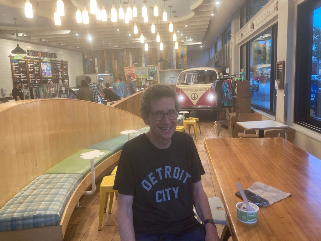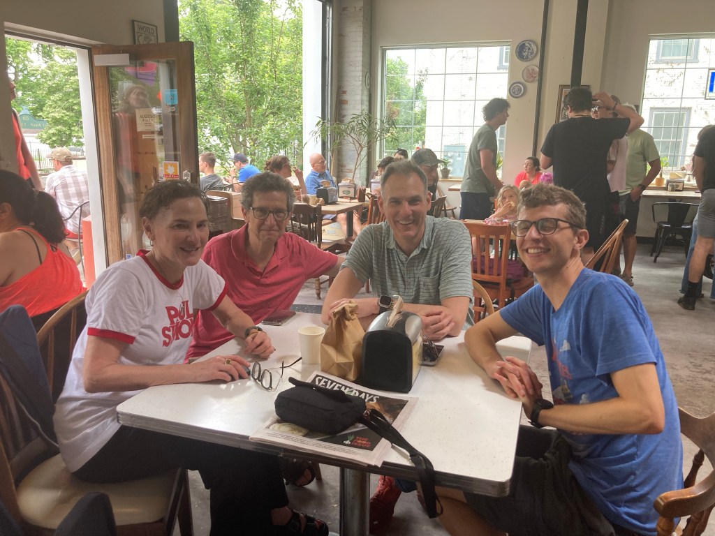 Although we were warned on Monday that our flight home on Tuesday was imperiled by possible thunderstorms in Chicago and advised to rebook, we found no great option so took our chances. The plane left on time but was stuck on the runway for maybe 20 minutes due to a thunderstorm…in Burlington. Then we were off, and arrived in Chicago on time. Noah also made it back to DC (a day late, after his flight was cancelled for no obvious reason.)
