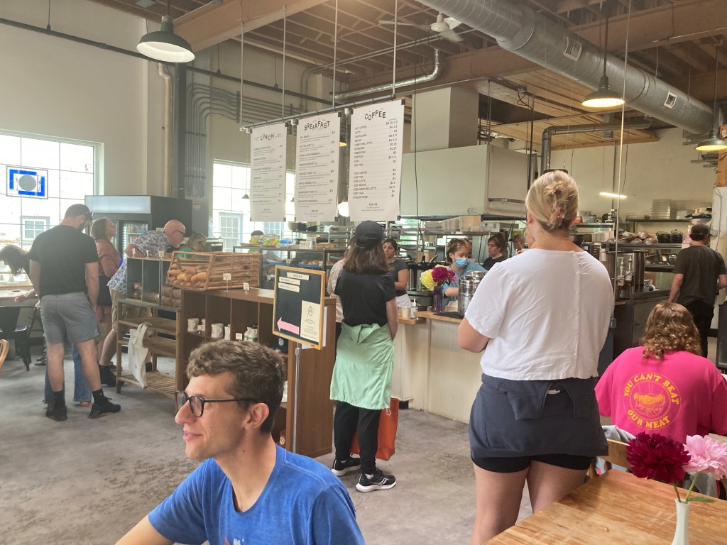99 degrees is highly unusual for Vermont but this is our lot yesterday and today. We drive south on scenes two-lane route 116 to the small town of Bristol where we had lunch at minifactory, a cool contemporary space: excellent food, very slow service. It took 45 minutes to get our food. I had a very basic entree- delicious flaky griddle buttermilk biscuit with homemade cream cheese and homemade rhubarb cherry jam. The restaurant’s odd name comes from its honey-based Jam-making minifactory. Noah and dirck had more complicated sandwiches but still… the place wasn’t that packed.