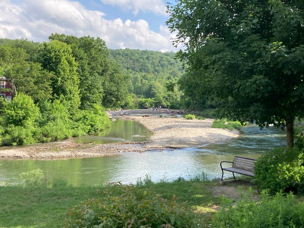 Our search for a place to swim in the river proved frustrating. I wasn’t willing to risk the huge slippery boulders leading to the enticing falls and flats. We watched teenage kids do crazy high drives from big rocks (and later learned a kid was killed in this area a day earlier.) We also got a $15 ticket for parking along the rural road, behind many other parked cars that also got tickets. Finally we ended up where we should Have begun- the perfect river entry spot in Waitsfield– shallow entry, sand not rocks or slippery boulders!