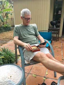 More delicious seafood plucked from the ocean nearby cold stone crab claws, grilled yellowtail snapper atop spinach with a light lemon cream sauce, grilled grouper with a light red pepper sauce, key lime pie topped by several inches of airy merengue. Riding back through town on our bikes (small bike lights flashing) was such a treat, breezing along quiet residential streets and much rowdier com