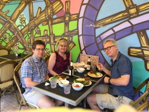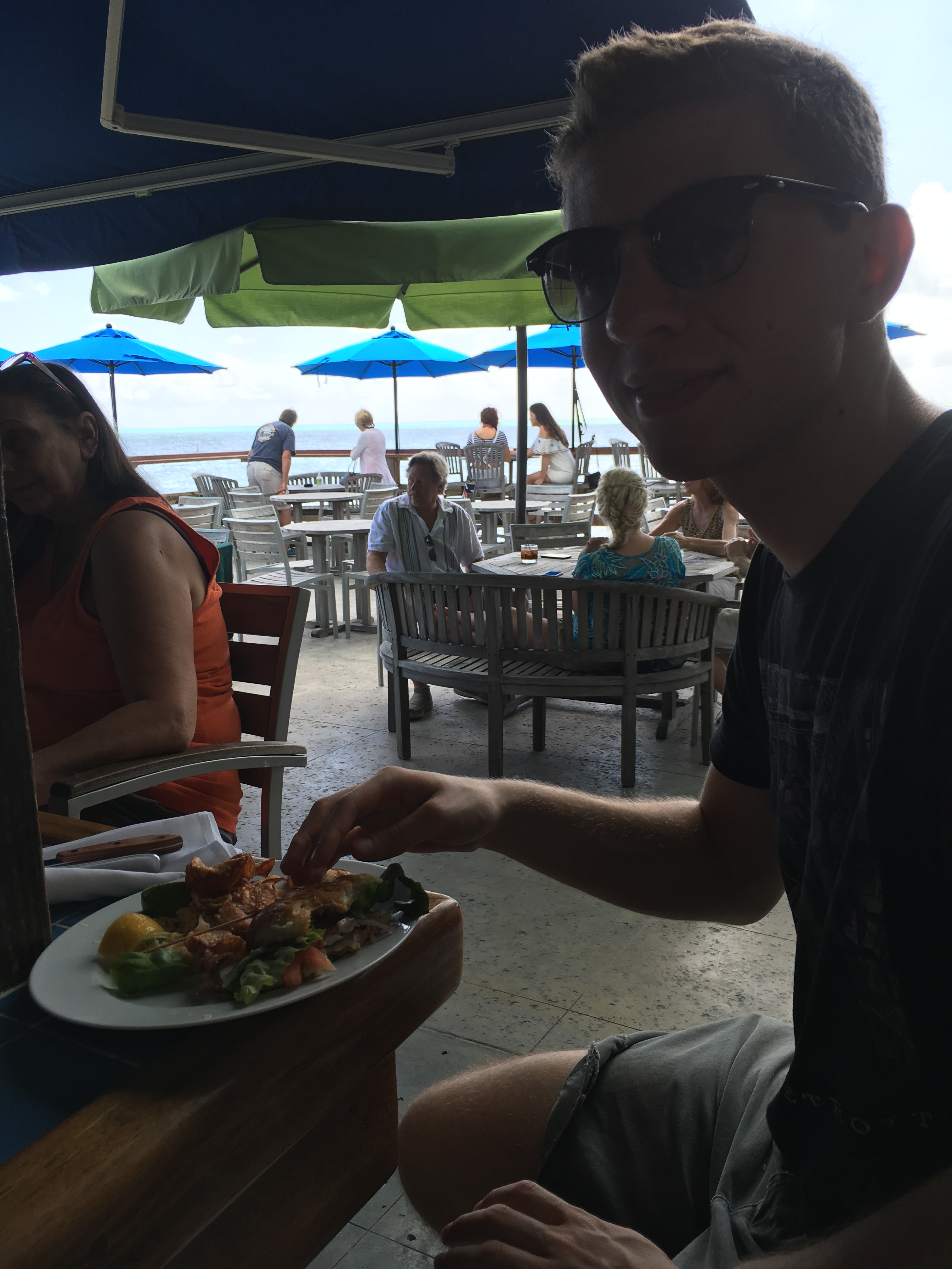 We rode over to the touristy harbor and walked our bikes along a narrow wood deck winding past the glistening water and fancy white boats, stopped at a window for Cuban coffee, had a late lunch at Pepe’s (excellent oysters ,cooked 3 ways, famous keys pink shrimp, superb blackened yellowish sandwich and delicious coconut cream pie. Pepe’s claim to fame is as the oldest restaurant here. We enjoyed sitting on the shady brick patio.