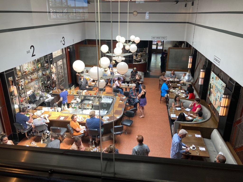 We took our hosts out to brunch The Grey, a fantastic restaurant in a brilliantly restored 1938 Art Deco former greyhound station (the new one is around the block). It’s a very fun space, with oval banquettes, a counter, remnants of the original pale green wall tiles, including original graffiti (a young server pointed out to me.) A three piece band with a terrific female singer performed while we ate delicious, sophisticated takes on southern fare including crab beignets, fried chicken with half dollar size corn meal hotcakes, “pigs head” (pork cheek). The chef Mashama Bailey is a James Beard award winner. I’m glad I booked (five weeks in advance).