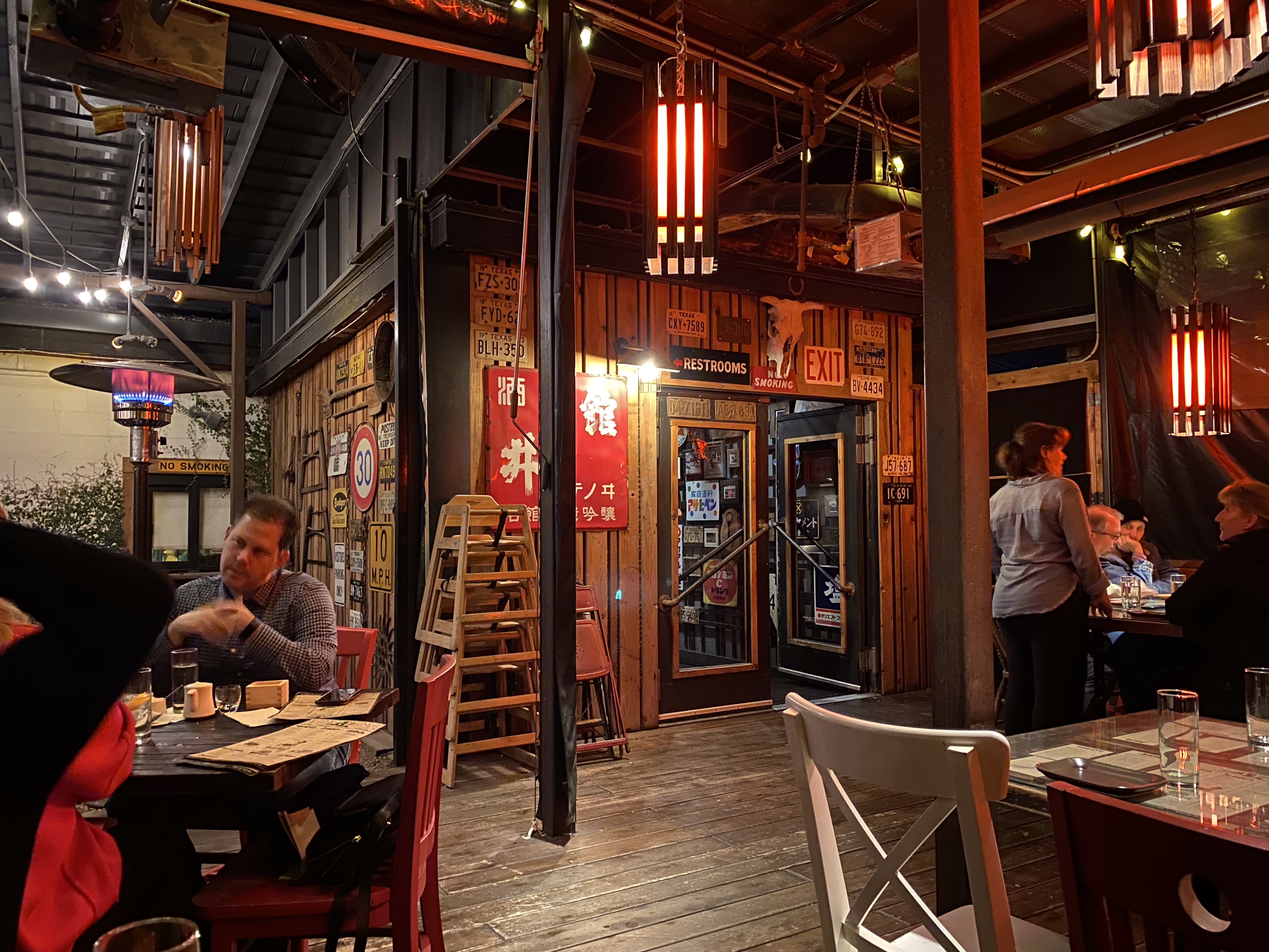 Tex-Jap sounds bad (unlike Tex-Mex) but Kemuri Tatsu-ya is a restaurant that fuses Texas and Japanese fare. Interesting idea and sort of worked. The restaurant designer must have had fun, mixing good ole boy Texas and Japanese izakaya (informal pub) decor, think cattle skulls and lanterns. Perhaps the most natural mashup we had was well-grilled smoked pork ribs with gochujang hot red chili paste. The corn with crema and chilis tasted almost Cuban. The ramen dipped in a broth with brisket bits was tasty but unwieldy.