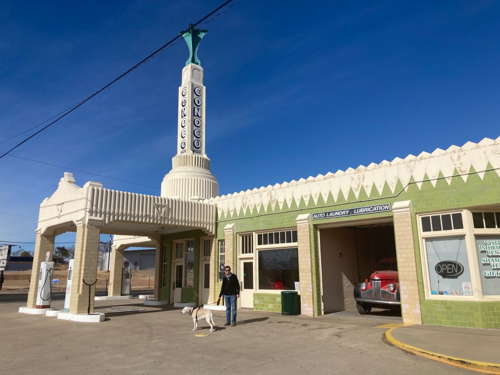 But today we did get off interstate 40 several times to take in the sights on the occasionally nearby parallel 2-lane Route 66. So glad we did. Shamrock, Texas, just over the Oklahoma border, has a spectacular “Tower conoco gas station (found via audio storytelling travel app HearHere) circa 1936 that was restored for a pretty penny. It looks even more remarkable at night when it is illuminated.