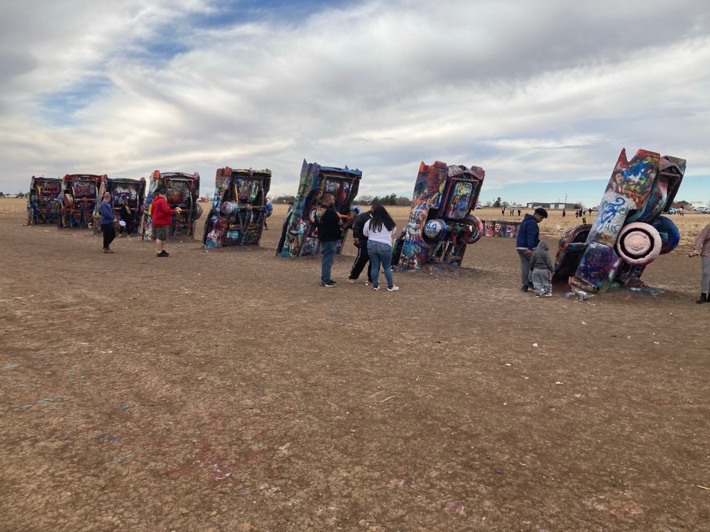 On to Cadillac Ranch, a famous public art installation (free!) way out in a field of corn stubble — 10 Cadillacs driven into the ground, nose-down, their rears (once sporting tail fins until they were vandalized which apparently the artists and benefactor were ok with) sticking up from the dirt at an angle, supposedly akin to the angle of the great pyramid at Giza, slathered in many colors of dayglo spray paint. Visitors-in-the-know bring their own spray cans (or buy at a trailer parked nearby). Several were spraying away, creating big coagulated bubbles of red, yellow, green, blue, black paint. Far out! The Cadillac Ranch is the work of San Francisco “art-hippies” bankrolled by an Amarillo billionaire in 1974. Set against a dramatic backdrop of endless land and sky, it was a sight.