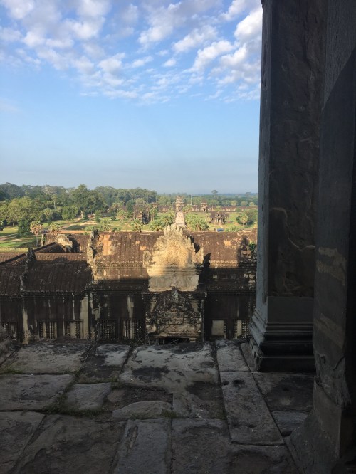 We left at 4:30 a.m. to visit Angkor Wat at sunrise (this was recommended in Macu Picchu too.) wise idea. one of the men who picked us up in the van appears to be our designated tuk tuk driver, a very nice young guy named Bros. The tuk tuk also reminds us of the contraptions we traveled in in Peru but more pleasant. It’s basically a two wheeled open air carriage with a roof pulled by a motorcycle. Bros sorted out our Angkor Wat game plan which we much appreciated.