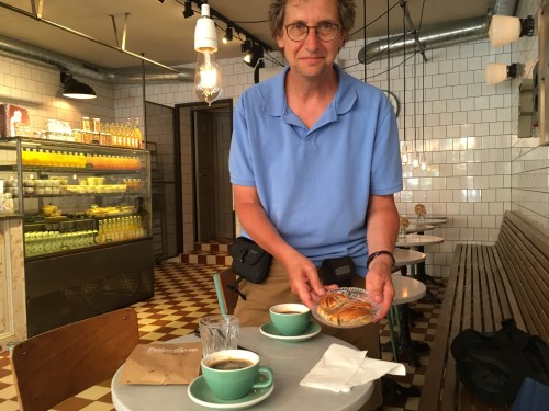 Just off the ferry, I found my way at the harbor to the #3 tram and got to the Kallio neighborhood. The hard part was finding and getting into this apartment. Thank God for a Shell gas station, which served as a visual marker, and some very kind Finns who helped me out during various times of need. This is a one-bedroom apartment in a functional modern apartment block. It wasn’t well marked and my directions weren’t clear but people helped in all kinds of ways. My host wasn’t here and I realized she wouldn’t be for several hours. Fortunately an extremely kind couple who run a vintage sign shop next door offered to let me leave my bags with them, which was huge! I made my way to a cafe with WiFi so I could connect with dirck who arrived safely in Chicago and is now on the road to Dsm and God knows what, given the flood damage in our neighborhood while we’ve been away.