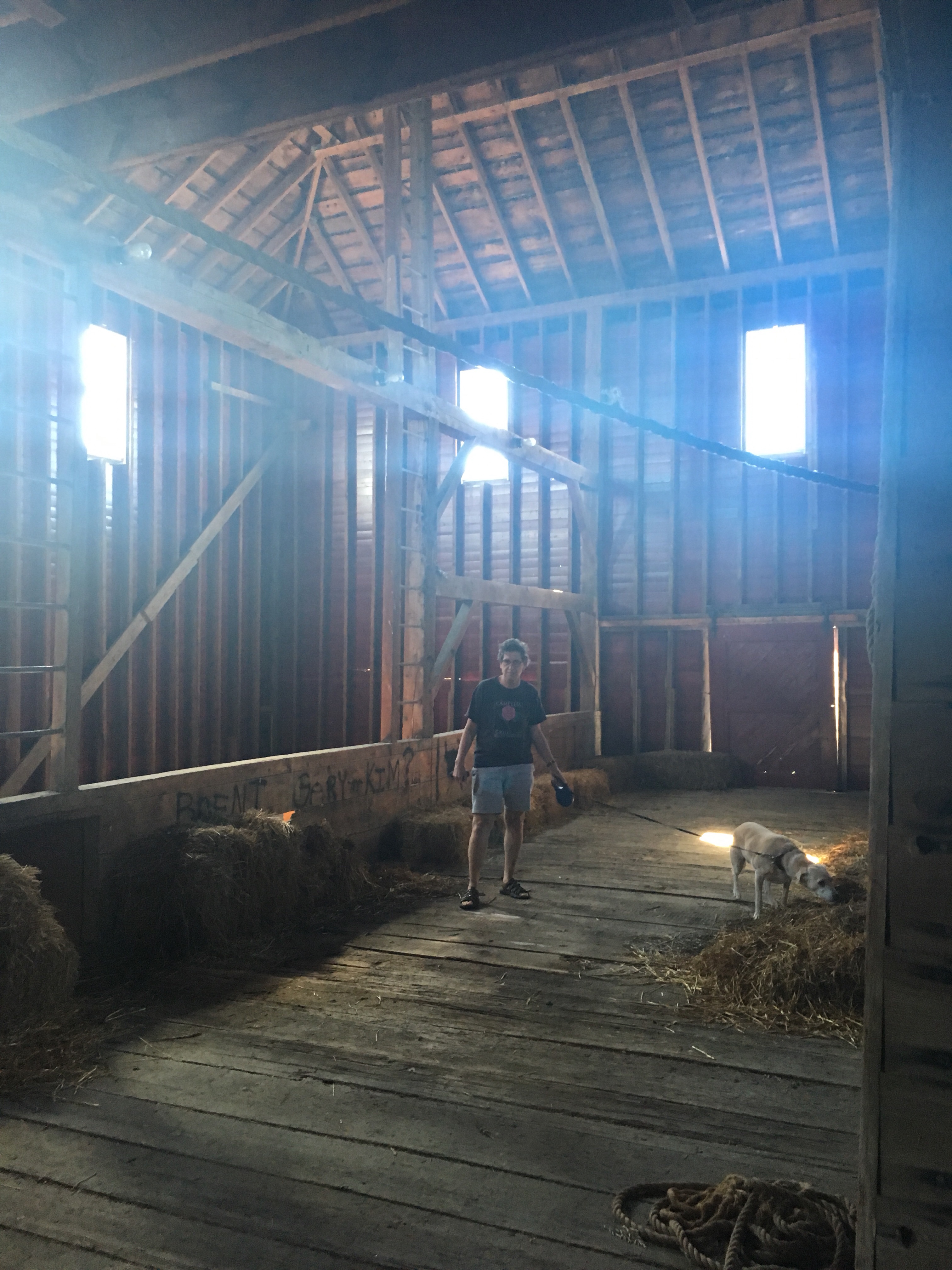 Built on a farm bought by the Handsaker family in 1853, the square barn inside was very rustic — they all were, with late afternoon yellow light filtering in through the windows and spaces between the wood plank walls, spotlighting the interior’s sturdy latticework of wooden beams.  (Because the barns were built before electricity, and electric lights. they often have lots of windows and natural light.) It was refreshing to wander around with no directions or posted cautions couched in legalese (i.e. warnings about taking your life into your own hands by walking on narrow rickety steps up to the barn’s second floor hay loft or wandering on the sometimes less that solid feeling wood planks of the second floor, past openings with sheer drops to the bottom floor.) The downside is that these barns were definitely not built to be disabled-accessible.  We brought our dog Millie along and had to keep her on a leash to make sure she didn’t do anything stupid/harmful.