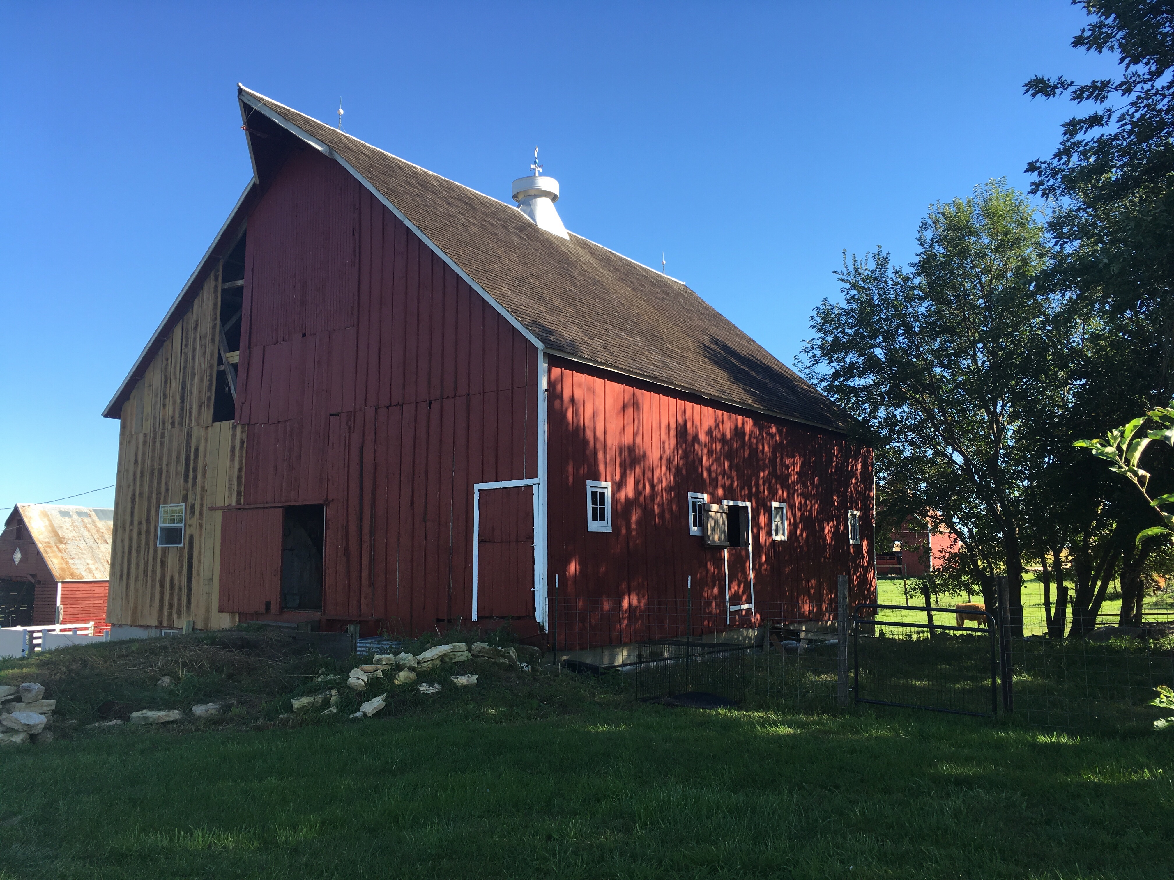The Barn Foundation’s website (full of interesting material) includes a piece by the previous owner written for the 2015 all-state barn tour, with great historical info:  The barn was built by an Irish family (the Mulcahys) who bought the land in 1872 from the federal government and they owned it until 1999 when it was bought, improbably, by a young couple from New York City who wanted to raise their kids on a farm. They started with the renovation- pouring a new foundation, putting on a wood shingle roof, and hiring “frame straighteners to square the roof.” Without this, the barn would have collapsed. The next owner (and author of this history) from Texas found the barn in distress, a decade after its renovation. He started another restoration, with a matching grant from the Iowa Barn Foundation. He loved the “old world air” of the farmstead, which includes other 19th-century burilindgs including two corn cribs, two chicken houses and a coal building. Interestingly, he notes: “I did not restore the barn to perfection; I believe one loses the historical essence of something when you replace all the parts with new. To that end, I’ve kept the original siding on the barn, warts and all. The barn has a sound foundation, roof, good doors and windows, plus nice red paint with white trim work. It looks like a structure that has survived the test of time and will for many years to come.”