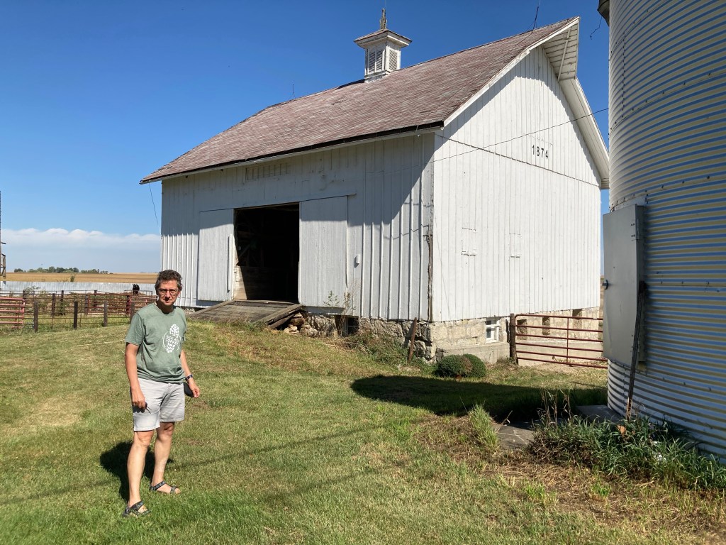 The four barns we visited differed  in terms of architecture and degree of restoration — although they were all similarly situated, on remote gravel roads in the countryside, usually beside a pretty old farmhouse and a prosaic modern metal shed that has largely replaced traditional barns. As my resident ag expert explained, old barns weren’t built for today’s agriculture. They don’t have big enough doors or enough space for large machinery.  And today’s livestock hang out outside, unless they’re stuck in big metal confinement sheds.