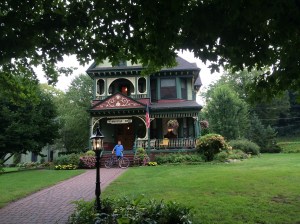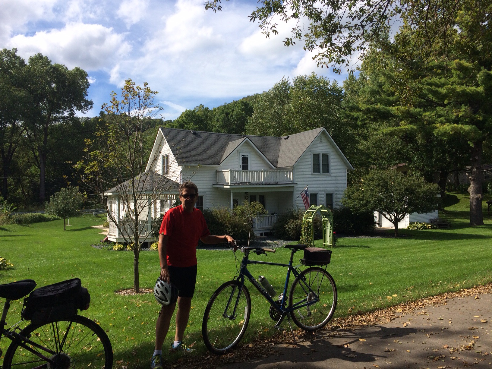 In the town of Jamaica (must find out how an Iowa town ended up with this name), we stumbled upon the bar Just One More, that had much-appreciated AC in its dark back room. A woman was grilling brats and burgers outside so we had a late lunch — two brats, a Fat Tire and lemonade – plus free popcorn – for $8 total. After chatting with some guys in the bar (one told us he was fixing his “first ex-wife’s” old farm), we ate in the screened-in porch at a high top table overlooking a small town rural scene (fields, an old ballpark etc.). The place seemed to cater to both kinds of bikers (motorcycles and bicycles.)