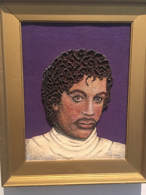 My favorite piece at the art show honoring the late great singer Prince at the U of Minnesota’s Weisman Museum was a portrait by an apparently well-known Minnesota “crop artist” who used a variety of crops (bromegrass, grits, canola, etc.) as her medium. The show was only two rooms worth of stuff – a lot of photos, some painted portraits, a giant mural and some glass sculpture but always nice to wander through the bright high-ceilinged spaces of the museum, designed by Frank Gehry.
