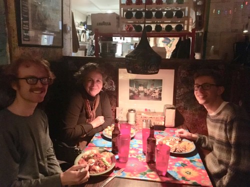 Nanook of the north here where it is decidedly snowier and colder in the Twin Cities than in Des Moines. Noah and Conor live in a sweet older apartment in the Uptown neighborhood of Minneapolis, which has a good selection of restaurants. We had excellent pulled pork with lime, black beans, chicken stew with green olives and capers and don’t forget the desserts (chocolate cake and flan) at Victor’s 1959 Cuban Cafe, a very atmospheric place, sort of a tar paper shack with the walls and seats covered in graffiti, including by another Betsy who sat in our booth sometime earlier in 2017.