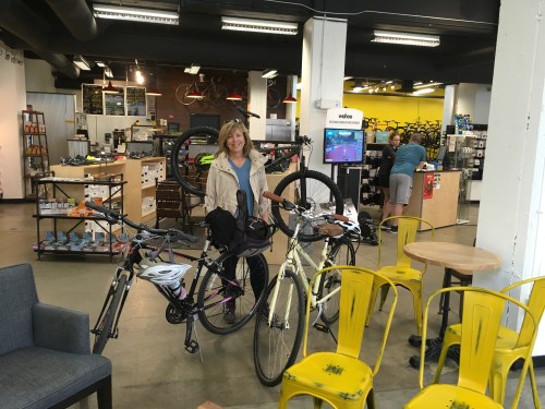 The trails were relatively quiet on a Monday but we didn’t want to “break the rules” so we ended up riding a few sections of the trail on the side of the access road lining the trail, which fortunately had few cars but was at times bumpy and sandy. No big deal. I also learned that the Lake of the Isles offers immediate and easy access to the Midtown Greenway trail, another favorite and we rode that subterranean-feeling trail to a cool trailside bike store/cafe called MPLS Coaster Brake Cafe, near the Global Market. I loved that you could wheel your bike right into the store/cafe and park it near some lounge chairs to take a break. No need to lock out front.
