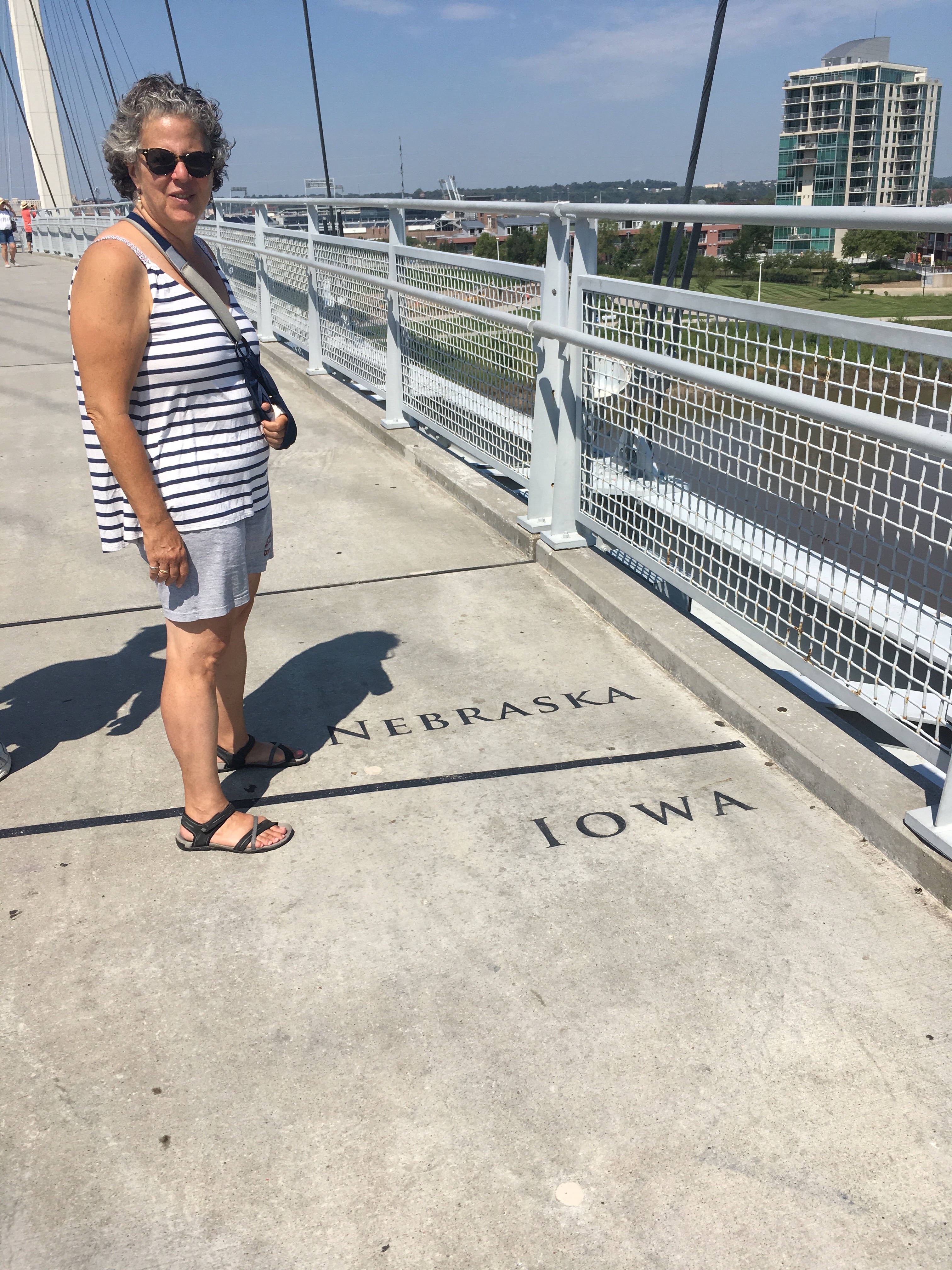 from there we drove downtown to the Nebraska side of the bob (Kerrey) pedestrian bridge whic has some great views of the two states and the river. Found a spot to be in Nebraska and Iowa simultaneously.
