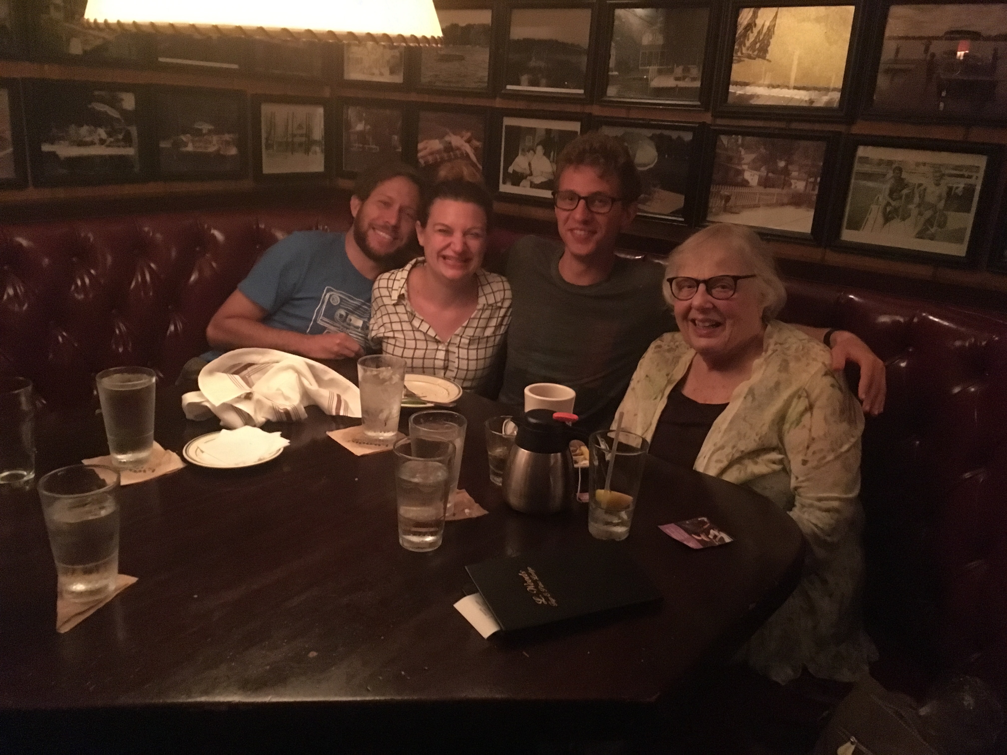 We stopped for cold brew and oolong coconut iced tea and a killer brownie at Metropolis, near the Glendale El station before wandering over to Hollywood beach where we could see that the crazy stunt planes we watched on our drive into the city along lake shore drive were done entertaining as part of the annual air and water show. Dinner was with wonderful aunt MAT at L. May, the ode to Midwestern supper clubs in Lincolnwoid. Excellent fish (trout with capers, grilled white fish and walleye), potatoes (twice-baked, garlic mashed) and bbq ribs. Great service and of course company.