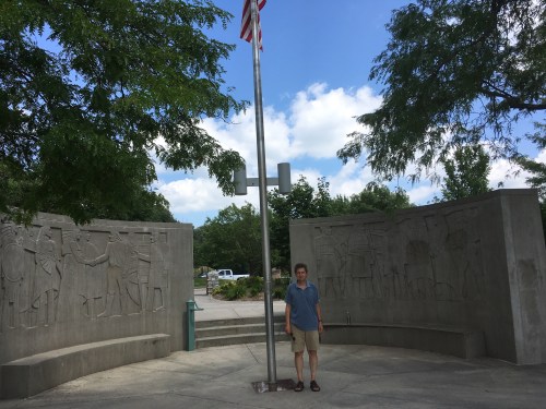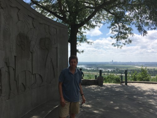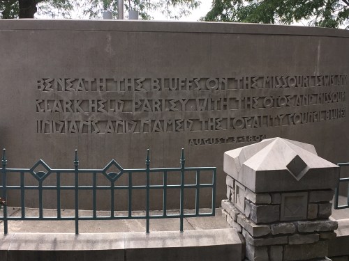 What did we do before Google and cellphones? (My mother, writing in her travel journal 25 years ago, asked “what did we do without faxes?”) We found this place, off a winding country road, past horse farms on the outskirts of Council Bluffs, after I googled to find a picnic spot with the best views of the river. It turned out to be a dramatic overlook with some 1930s’ poured concrete, possibly WPA reliefs, depicting the “council.” It seemed like a local secret. There were several well positioned picnic tables, although we could have used a little shade.