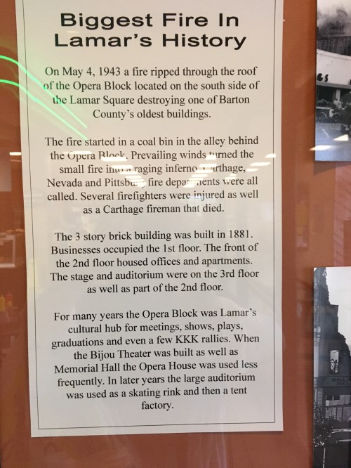 Stopped for gas in Lamar and toured a local outlet of the “Beef Jerky Warehouse,” which had more varieties of jerky than imaginable and some interesting T-shirts. We were taken aback, while reading a little wall sign about Lamar’s history, to see a casual mention of the KKK meetings (once) held in town.