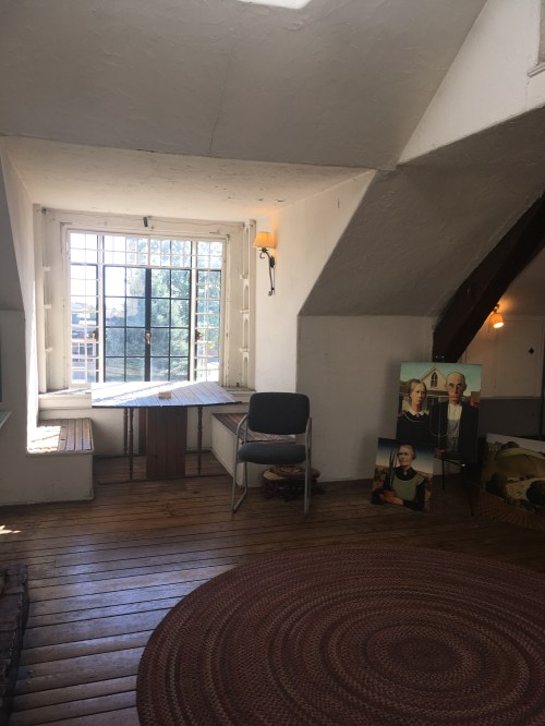 We drove right past the Grant Wood Studio in downtown Cedar Rapids. Who knew it was tucked above a carriage house behind a former funeral home? But very glad we found it because it was really interesting. We watched a short film about Woods’ life in and around Cedar Rapids and then walked up an outdoor staircase to a small second-floor loft above the carriage house where Grant lived with his mother (and sometimes his sister) and painted some of his most famous paintings, reproductions of which were propped up on an easel in the middle of the main room, a white-walled room with heavy wood beams and lots of natural light flooding in from big windows and a cupola.