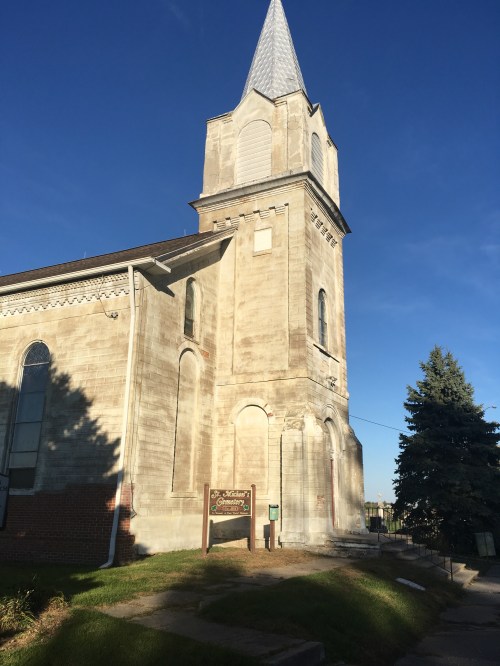 Dirck was craving a burger so we stopped in Iowa City at Shine’s at about 4 p.m. and found out there’s a Sunday special – until 5 p.m. We each had burgers and fries for $12.73 total. Cheapest dinner we’ve had in a very long time. Maybe ever. The weather was so pretty that we decided to take backroads home, following F52 and a few other remote roller-coaster roads south of Interstate 80. They often struck us as “RAGBRAI roads.” We sometimes lost our way but found cool things including an unusually grant Romanesque church (St. Michael’s Catholic) in the small unincorporated town of Holbrook, circa 1867 (according to the National Historic Register plaque nearby.) Several old gravestones dated back to the 1880’s and most are Irish settlers. More details here.