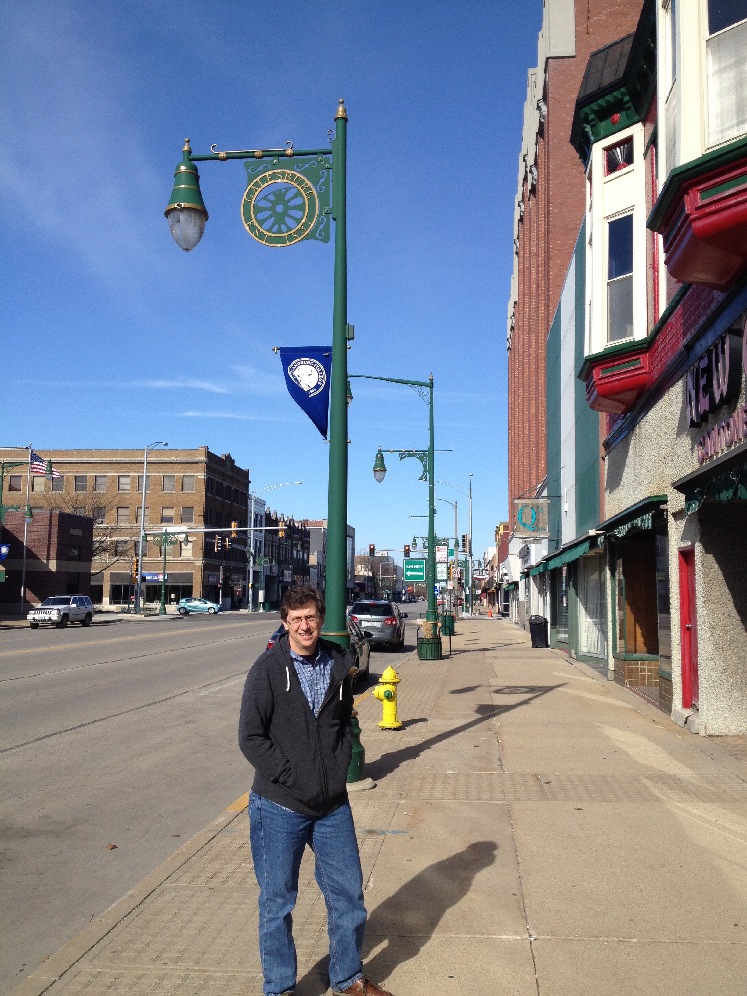 Pretty morning here in the central (we think) lllinois city of Galesburg where we stopped for what turned out to be excellent coffee and apricot Danish at Innkeeper’s coffee. Art Deco exterior, stamped tin roof and sunny nouveau Mediterranean vibe inside. we walked a little down Main Street, deserted at 9:30 am and clearly trying to hold on with lots of old storefronts with great tile work, masonry, stained glass, copper…some empty, some with antique stores, remnants of an industrial past. Drove briefly past the Knox college campus, circa 1837, site of one of the Lincoln Douglas debates (or elsewhere in Galesburg…also home poet Carl Sandburg.)