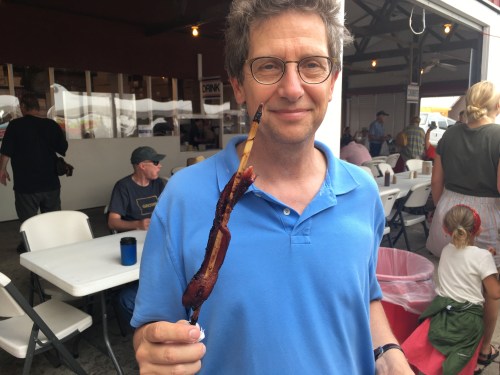 We also happened to hear former Colorado Governor Hickenlooper, who seems like a good guy — and although we skipped the Cory Booker soapbox appearance, we passed him and a large entourage, reportedly in search of vegen-worthy fair food. Speaking of non-vegan-worthy food, I fell hard for the maple syrup cured-pork belly on a stick sold at the Iowa Pork Producers tent.