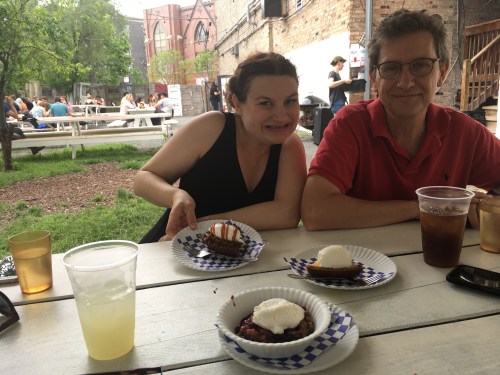 This afternoon we went to the Sunday farmers market in Logan Square and to delicious Bang Bang Pie shop, which serves, yes, pie — sweet and savory. We had excellent chocolate caramel pie and key lime pie (they’d run out of strawberry rhubarb) and sampled the chicken pot pie. Also had great homemade lemonade with free refills. We also walked Millie around E & R’s lovely Edgewater neighborhood.