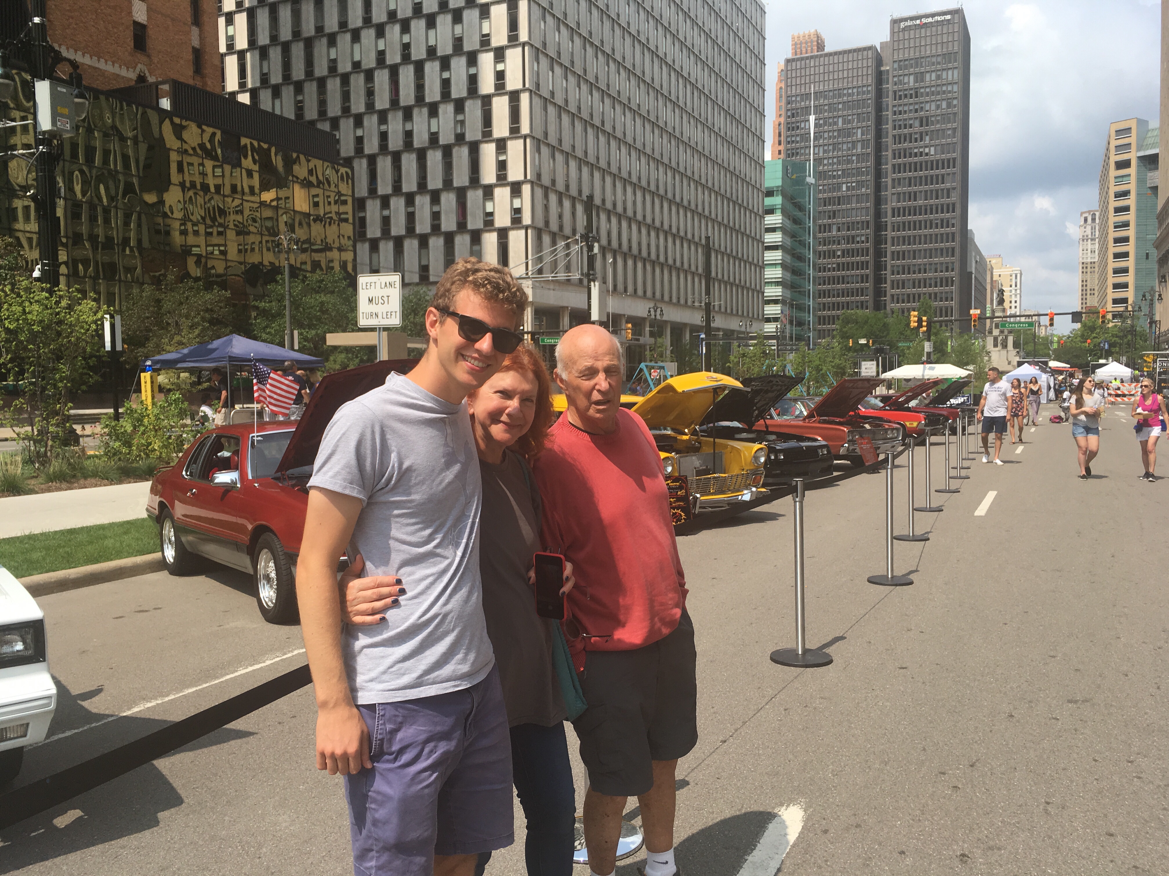 Not only did we not have to talk our relatives in suburban Detroit into exploring downtown, they suggested it! Detroit gets better with our every annual visit. We dropped by what is now an old favorite must see, the stunningly ornate Guardian Building and then followed a comfortable-sized crowd to a thriving pocket park – campus martius – with cafes (Parc looked particularly good), outdoor tables, sculpture and a sandy beach (minus the waterfront — the Detroit river is a few blocks south). Kids played in the sand, small groups (black and white, although not mixed) sipped drinks at outdoor tables, two bands played an stages near muscle cars on display (a fraction of the vintage cars participating in the annual Dream Cruise further north on Woodward Avenue). Barbara forgot her purse at our table, walked back to it after a few minutes and there it was waiting for her, all items accounted for. Gives you hope for Detroit’s continued renaissance.