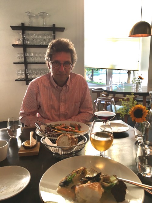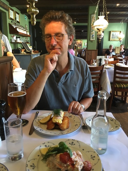 Tonight was our last splurge “new-Nordic” dinner (neo-fjords really) at Lysverket, in the Kords museum area. The food was outstanding and great service and atmosphere. Not as “out there” as Relae in Copenhagen and larger portions. We had a delicious seafood broth served beside a bowl with two shrimp dumplings, well prepared white fish (which restored my faith in fish after last night’s bad stuff) that was crispy on outside and moist inside, full of flavor and accompanied by various unrecognizable but flavorful things. Dirck had some delicious broccolini with spring onions and egg yolks and some sort of delicious pork dish. We really loved this city and our Airbnb in the attic of an old old white wooden house in Bryggen, the historic area, was perfect.